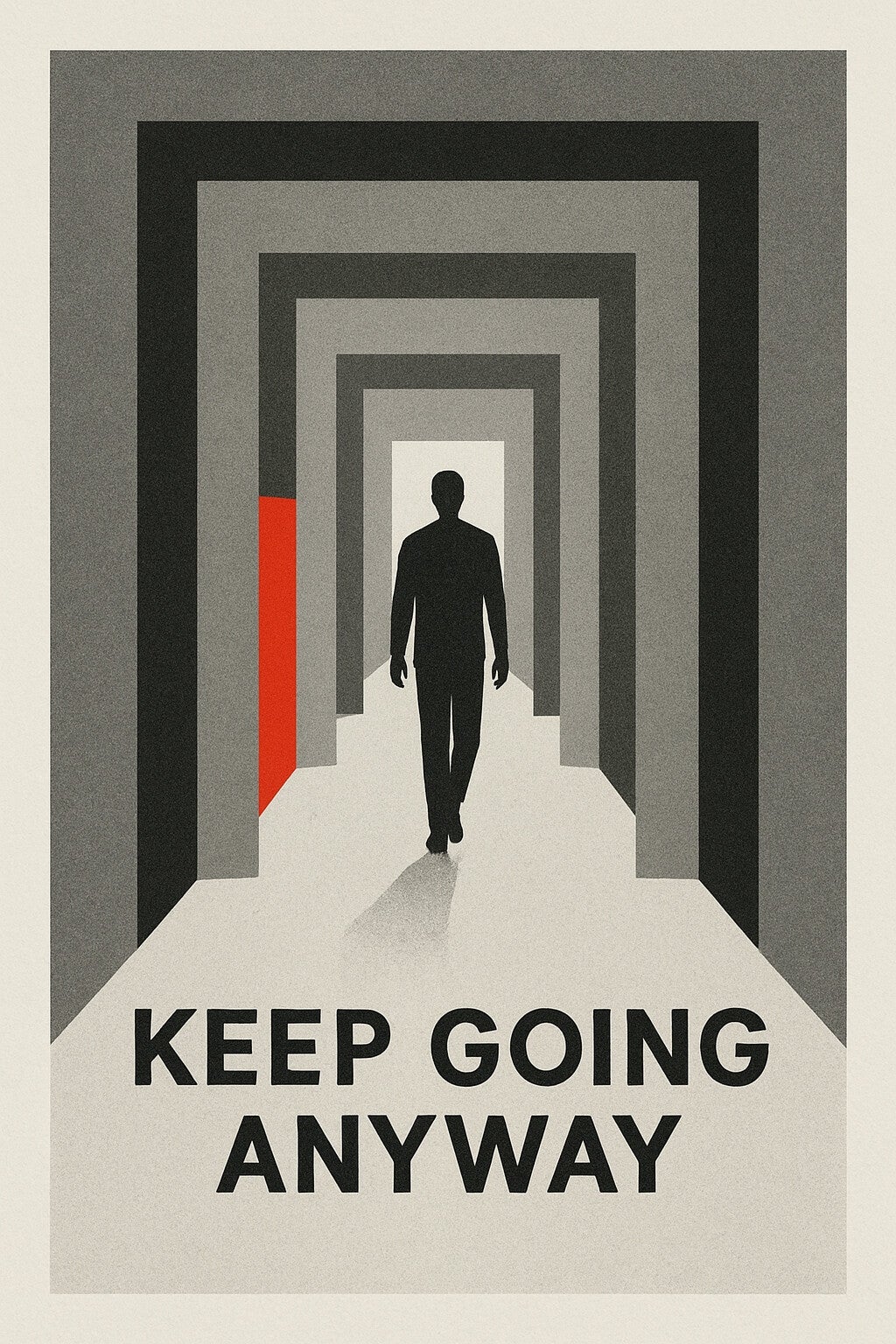 A bold, minimalist poster featuring a lone figure walking through repeating corridors, framed in shades of grey with a single red accent. A quiet reminder of persistence — calm, steady, and determined. Printed on premium matte paper with crisp contrast and a timeless modern finish.