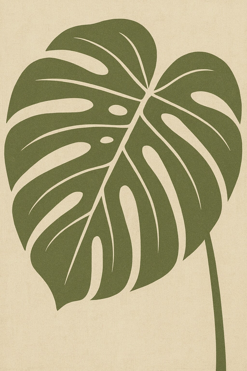 A clean, modern print featuring a stylized Monstera leaf in deep green against a soft beige background. The bold simplicity and organic form create a serene, nature-inspired statement piece suited for contemporary interiors. Ideal for living rooms, studios, or minimalist spaces seeking a touch of natural balance.