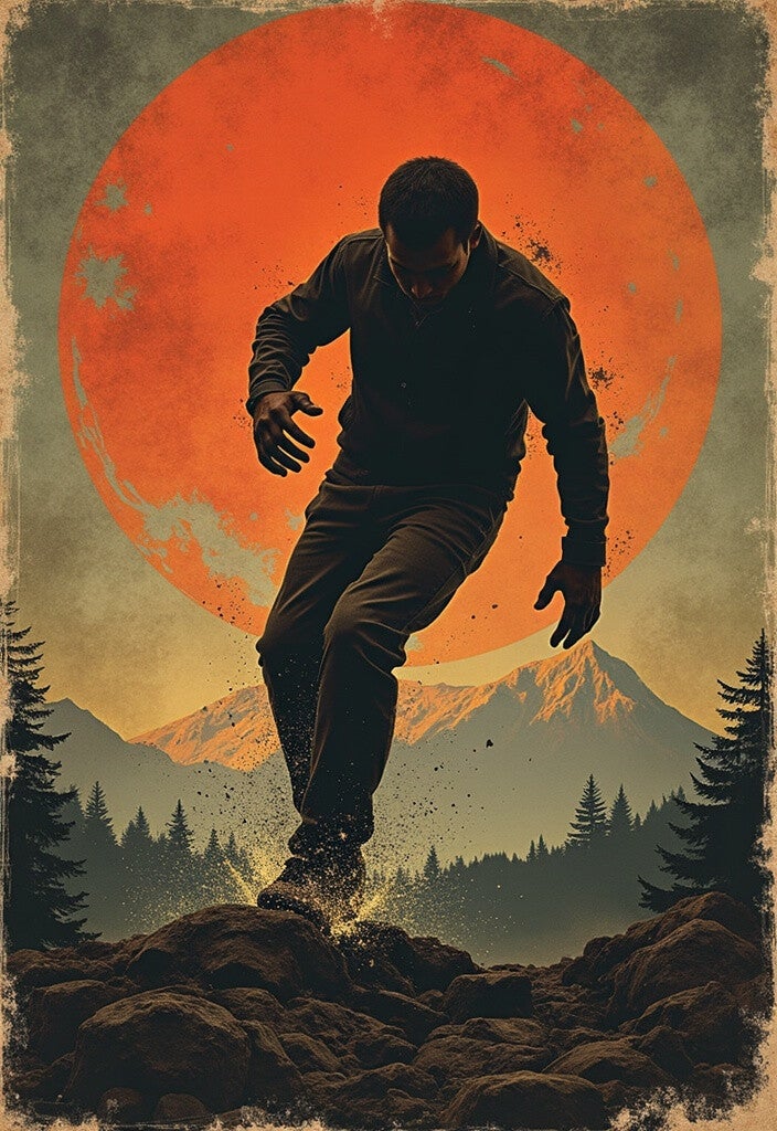 A powerful surreal composition featuring a lone figure emerging from the earth against a massive glowing sun and mountain backdrop. The contrast of warm and dark tones captures determination, resilience, and transformation. A commanding artwork for modern interiors that celebrate energy, ambition, and inner power.