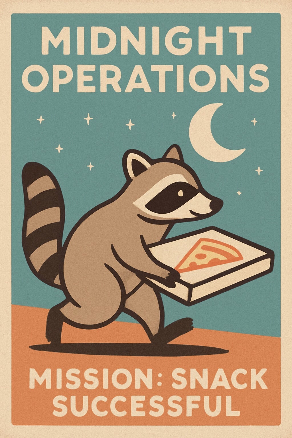 A playful vintage-style illustration of a raccoon on a covert pizza mission under a crescent moon. Warm retro tones and clean lines add charm and humor, making it ideal for kitchens, dorms, and lighthearted interiors.