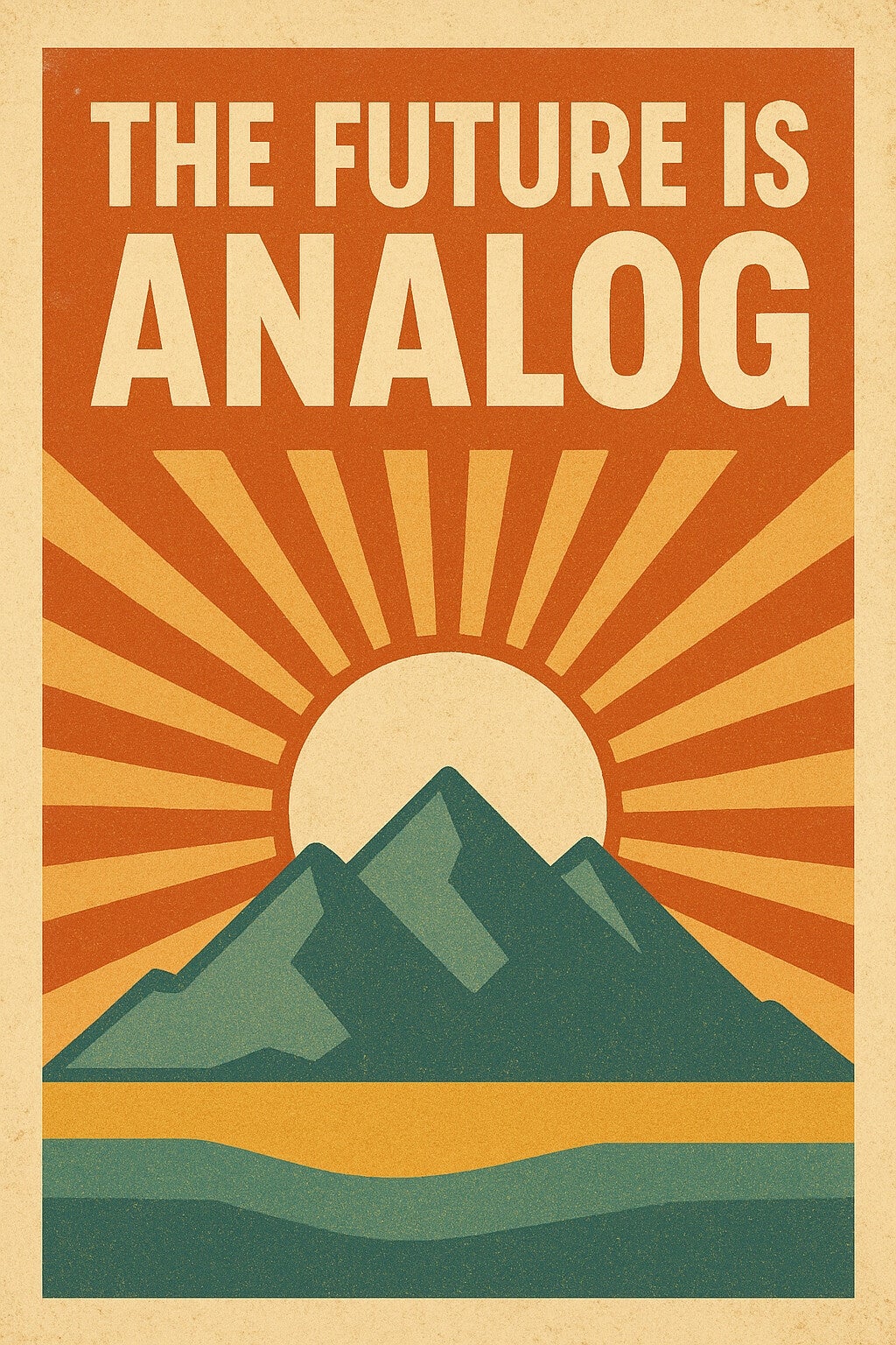 Mountains and a rising sun in retro colors, asserting a return to physical, tactile life.