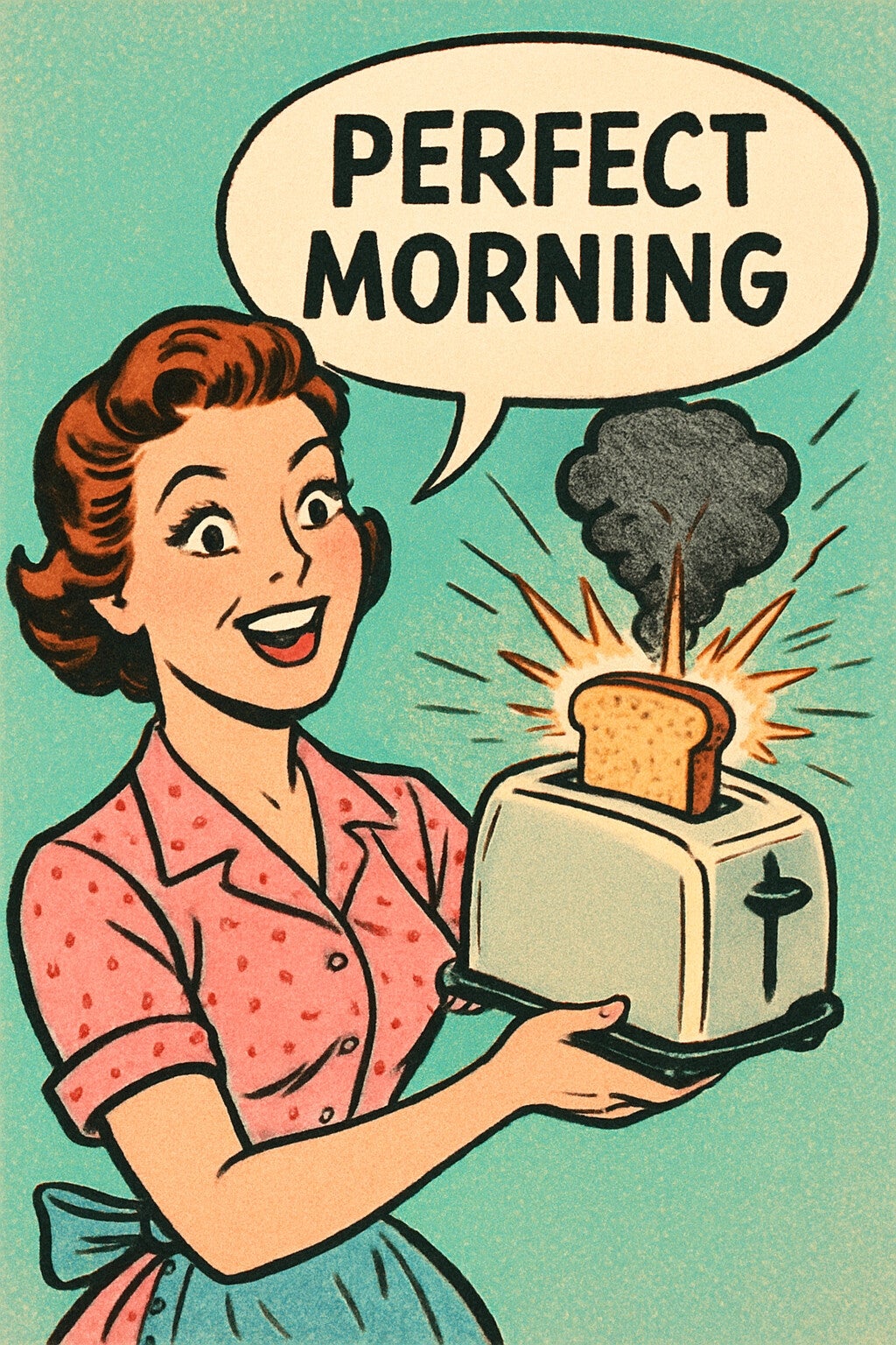 A retro woman beaming at a toaster producing burnt, smoking bread, masking disaster with forced cheer.