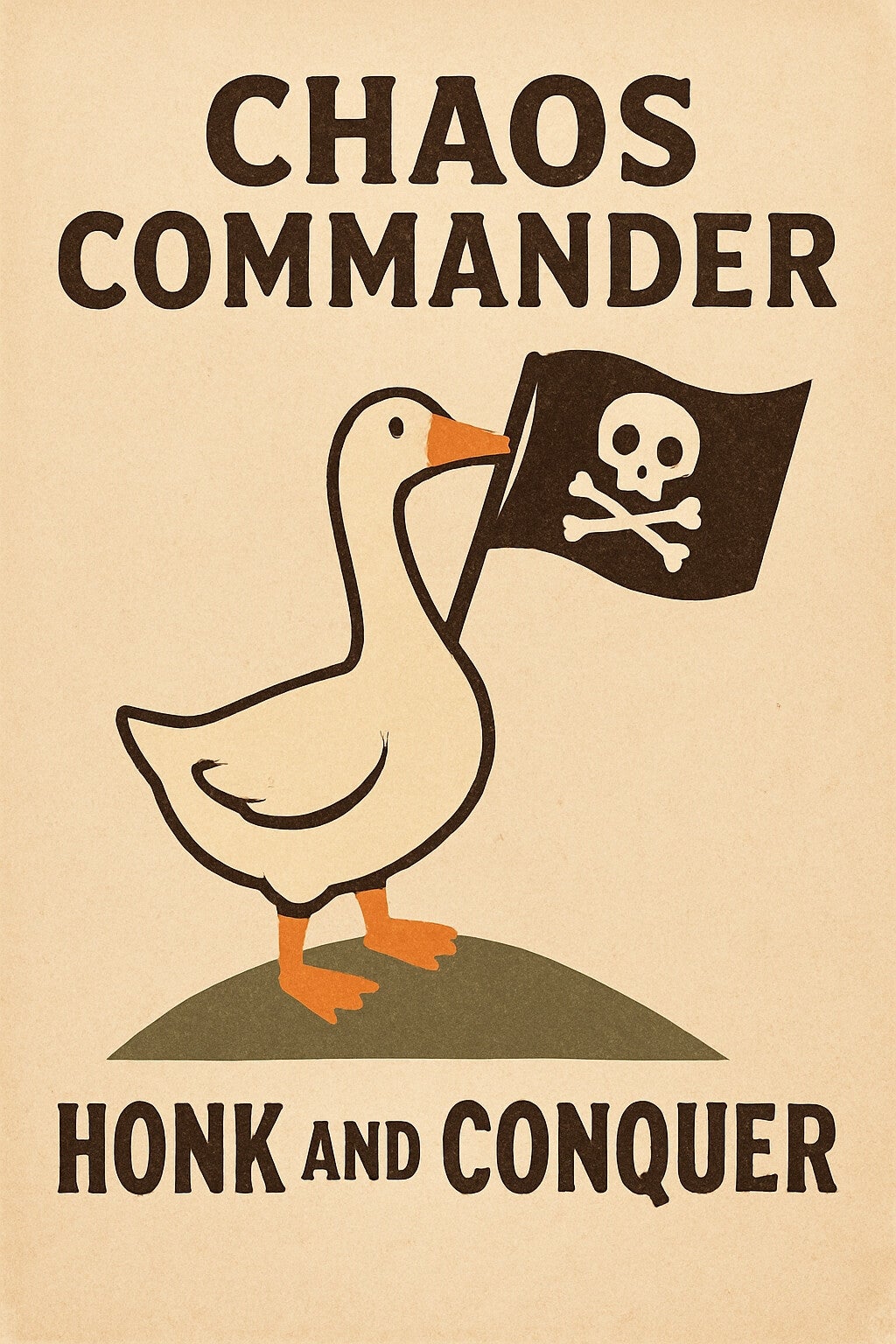 Goose with a pirate flag. Disorder framed as strategy, mischief treated as doctrine.