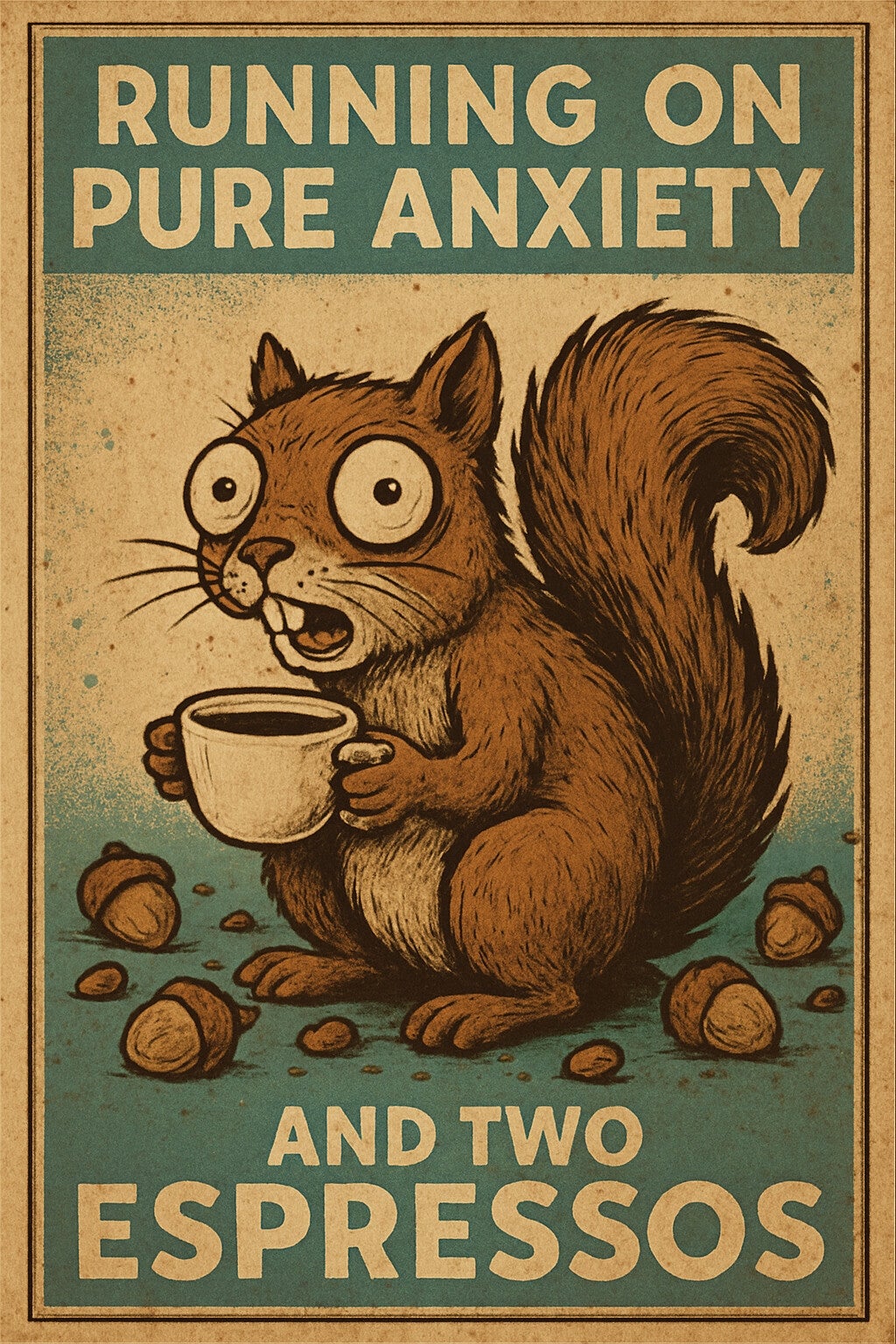 Wide-eyed squirrel clutching coffee. Agitation exposed as fuel source.