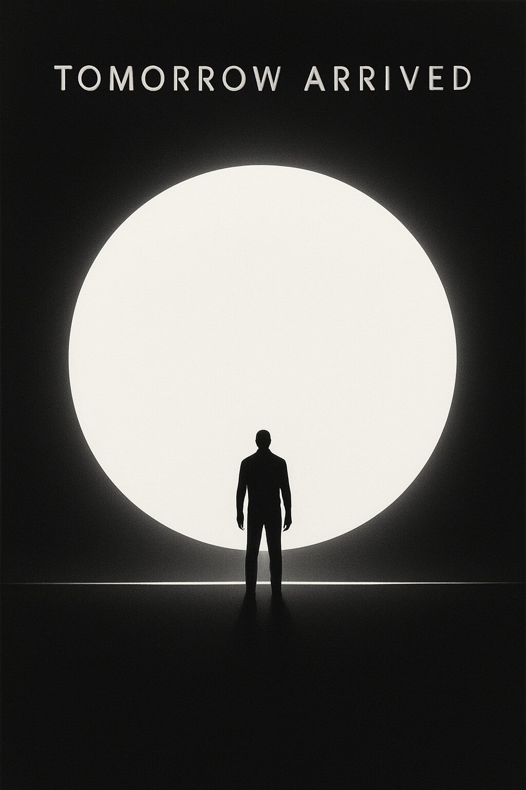A lone figure facing a vast white sphere. Threshold crossed, future no longer hypothetical.