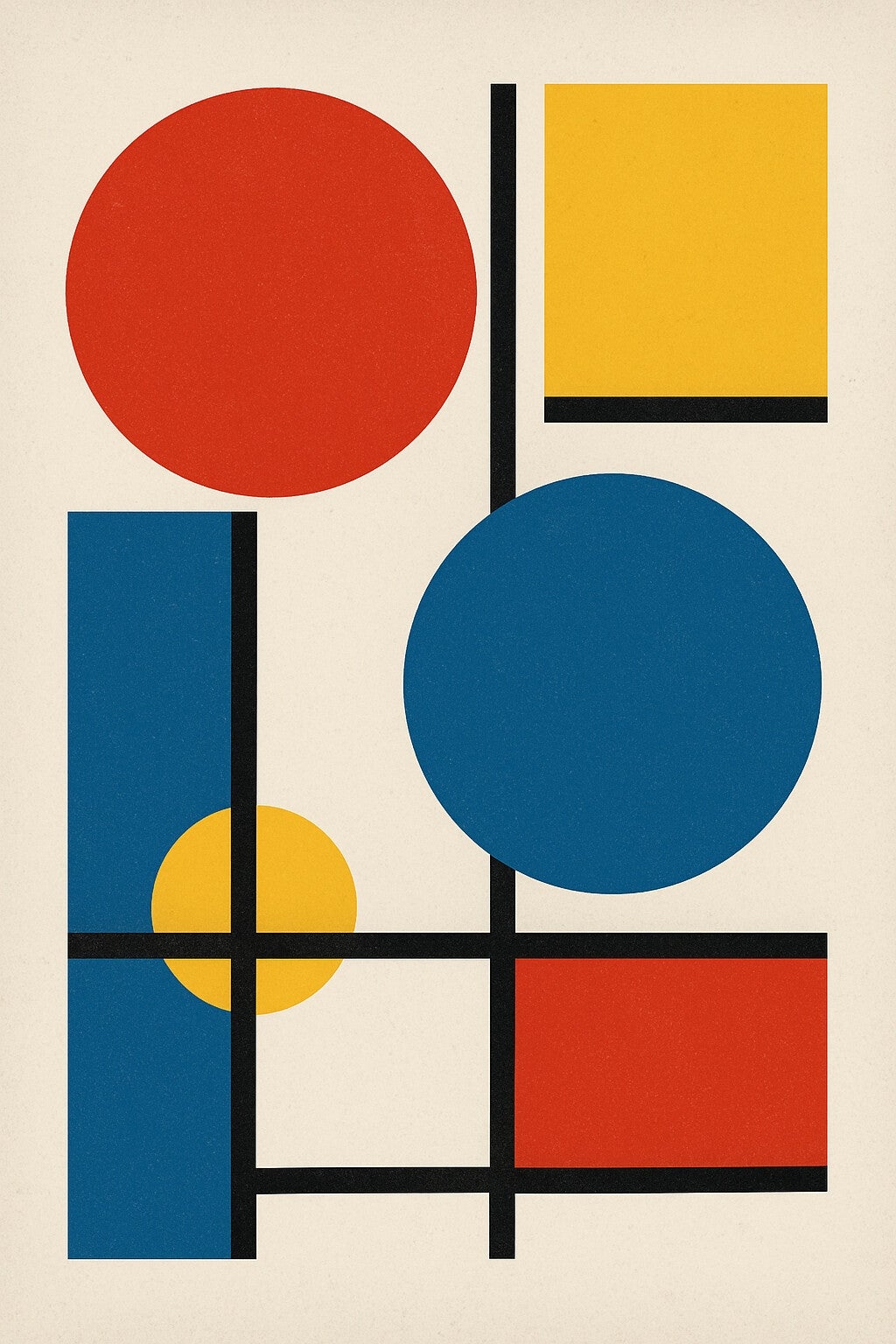 Primary colors locked inside rigid black divisions. Structure imposed on chaos.