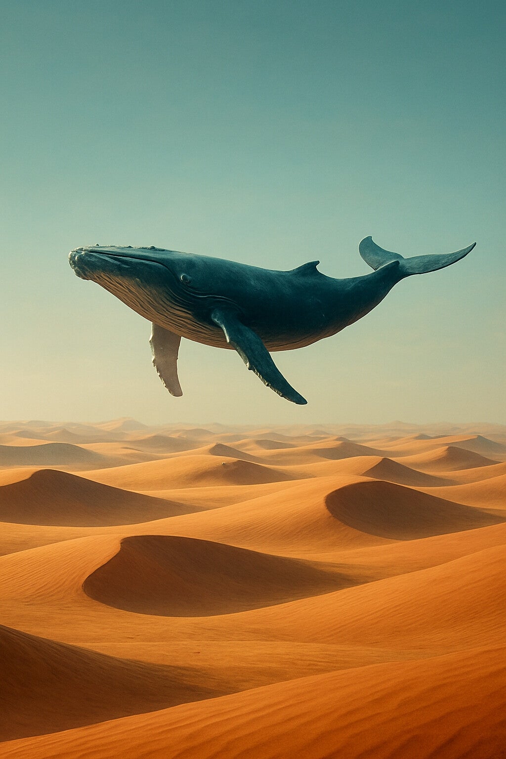 A surreal scene of a blue whale floating over endless sand dunes, combining oceanic scale with desert silence.